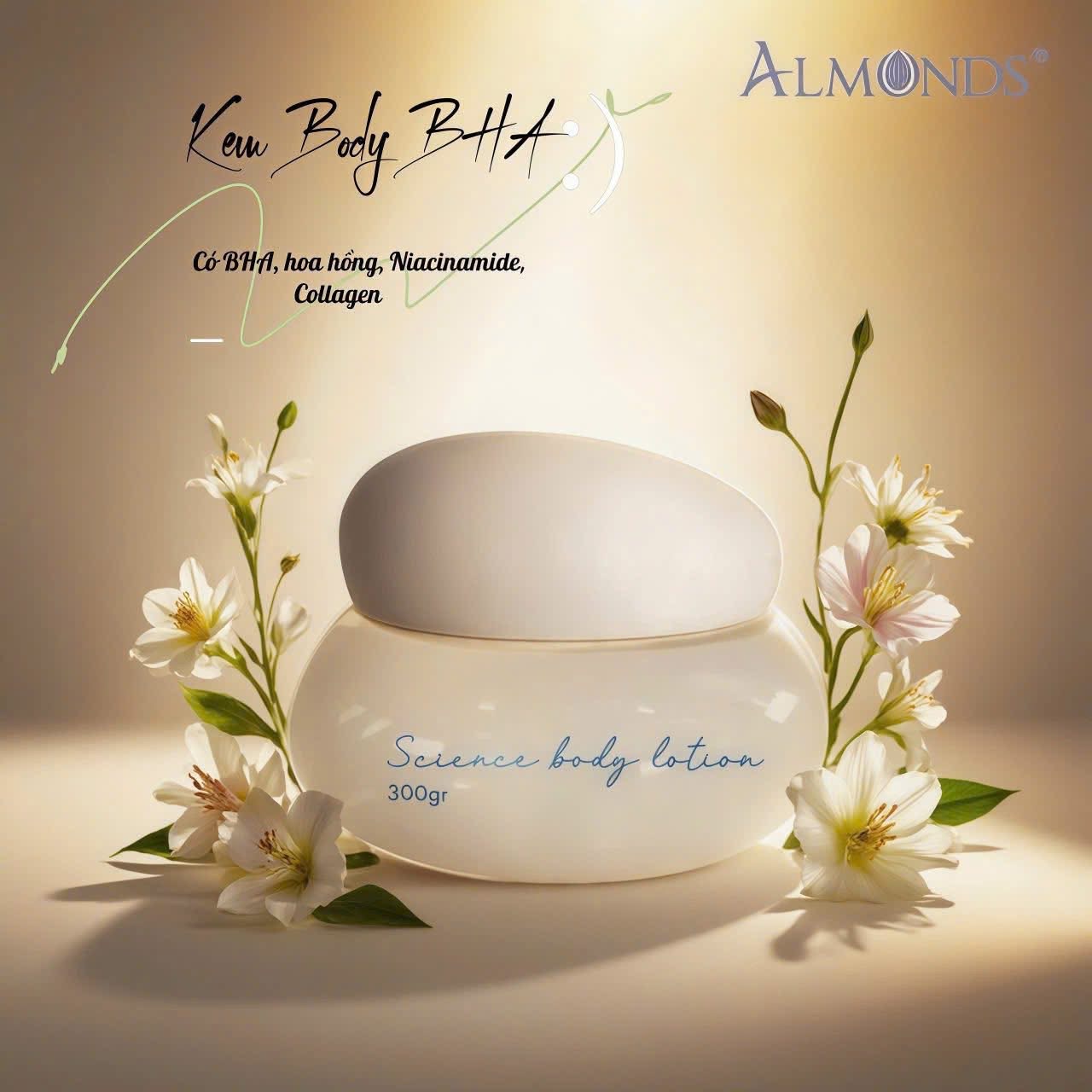 Khám phá dòng kem body Almonds: Gạo – Trứng – BHA. Dưỡng trắng, phục hồi, làm mịn và sáng da toàn thân chỉ sau vài ngày sử dụng.