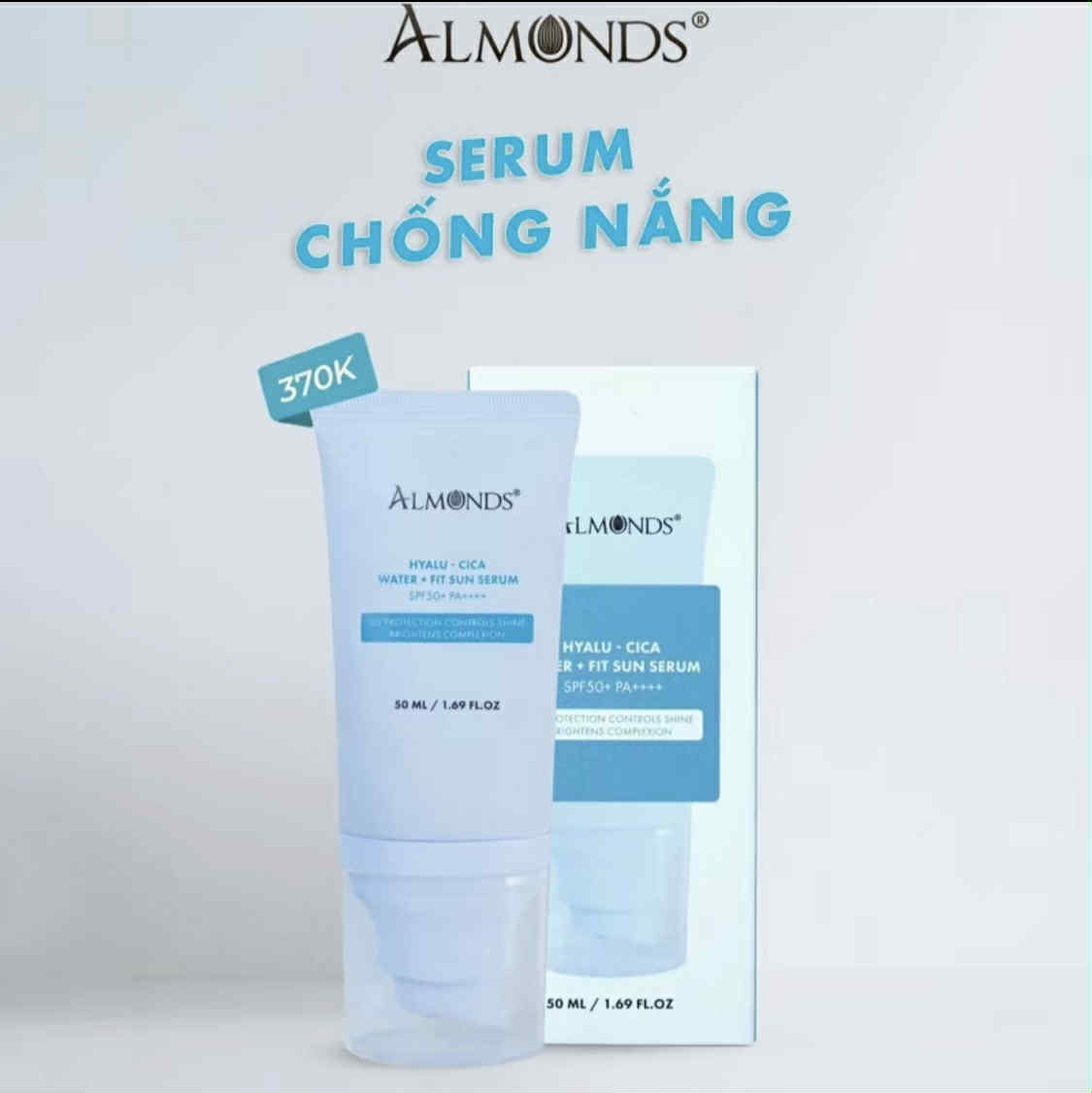 Serum chống nắng Almonds Hyalu-Cica Water + Fit Sun Serum SPF50+ PA++++ giúp bảo vệ da khỏi tia UV, cấp ẩm, làm dịu da, kiểm soát dầu và phù hợp cả da peel, da nhạy cảm.